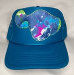Vintage Hawaiian Mu’umu’u fabric hand stitched onto a turquoise trucker