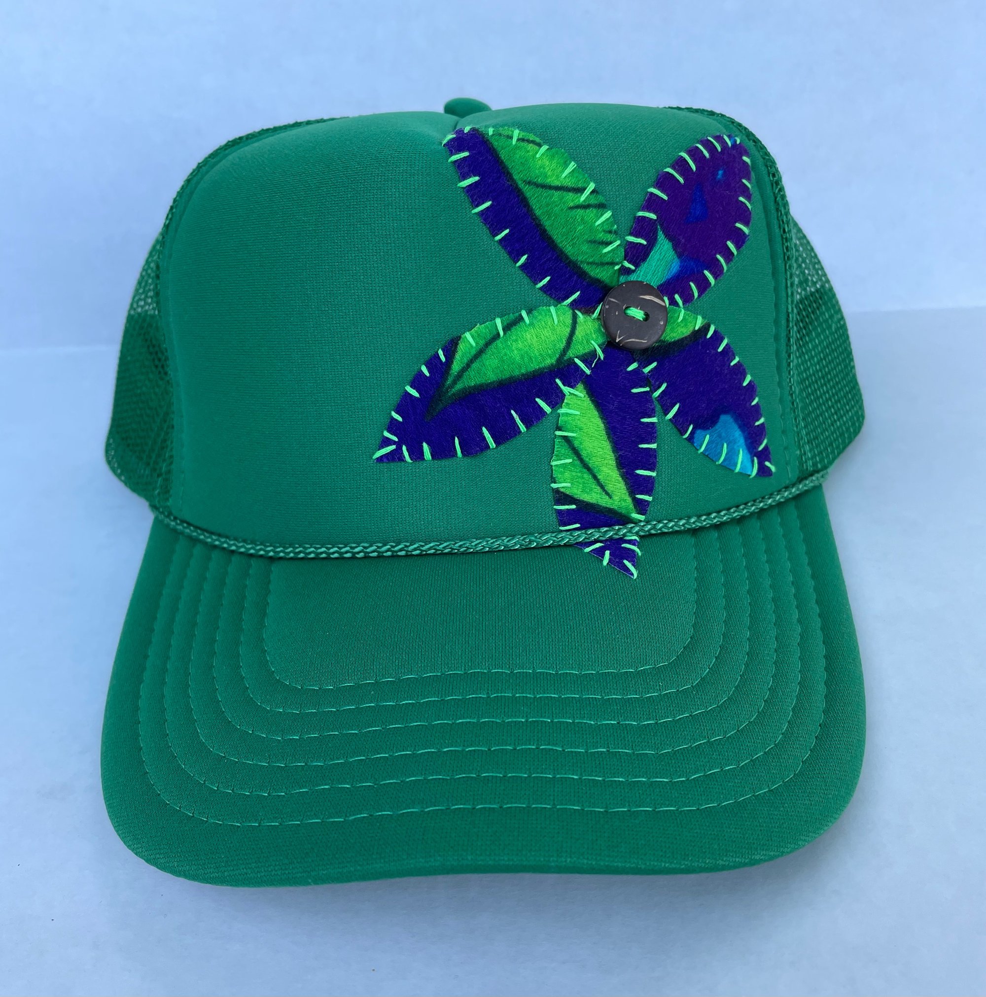 Vintage Hawaiian fabric hand stitched on an emerald green trucker.