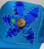 Vintage Hawaiian fabric hand sewn onto a turquoise trucker.