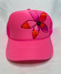 Neon pink trucker with Vintage Hawaiian fabric, hand stitched Pua. Coconut button