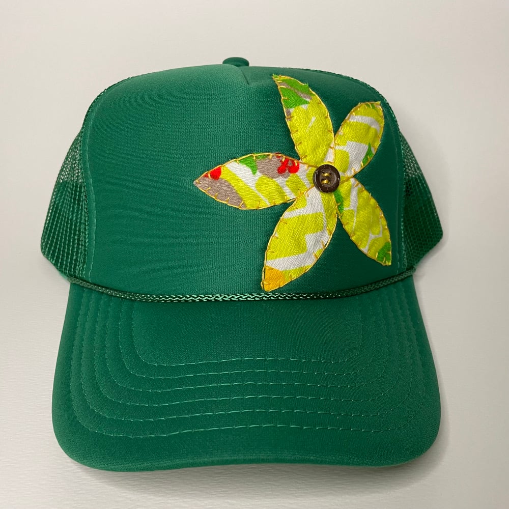 Bright green Otto foam trucker with vintage Hawaiian fabric hand embroidered. Coconut button center