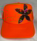 Vintage Hawaiian Mu'umu'u fabric hand stitched onto a NEON orange trucker. Coconut button center.