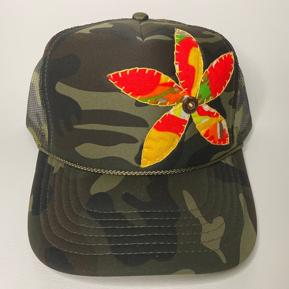 Camo green trucker with Vintage Hawaiian fabric Pua. Hand stitched. Coconut button center