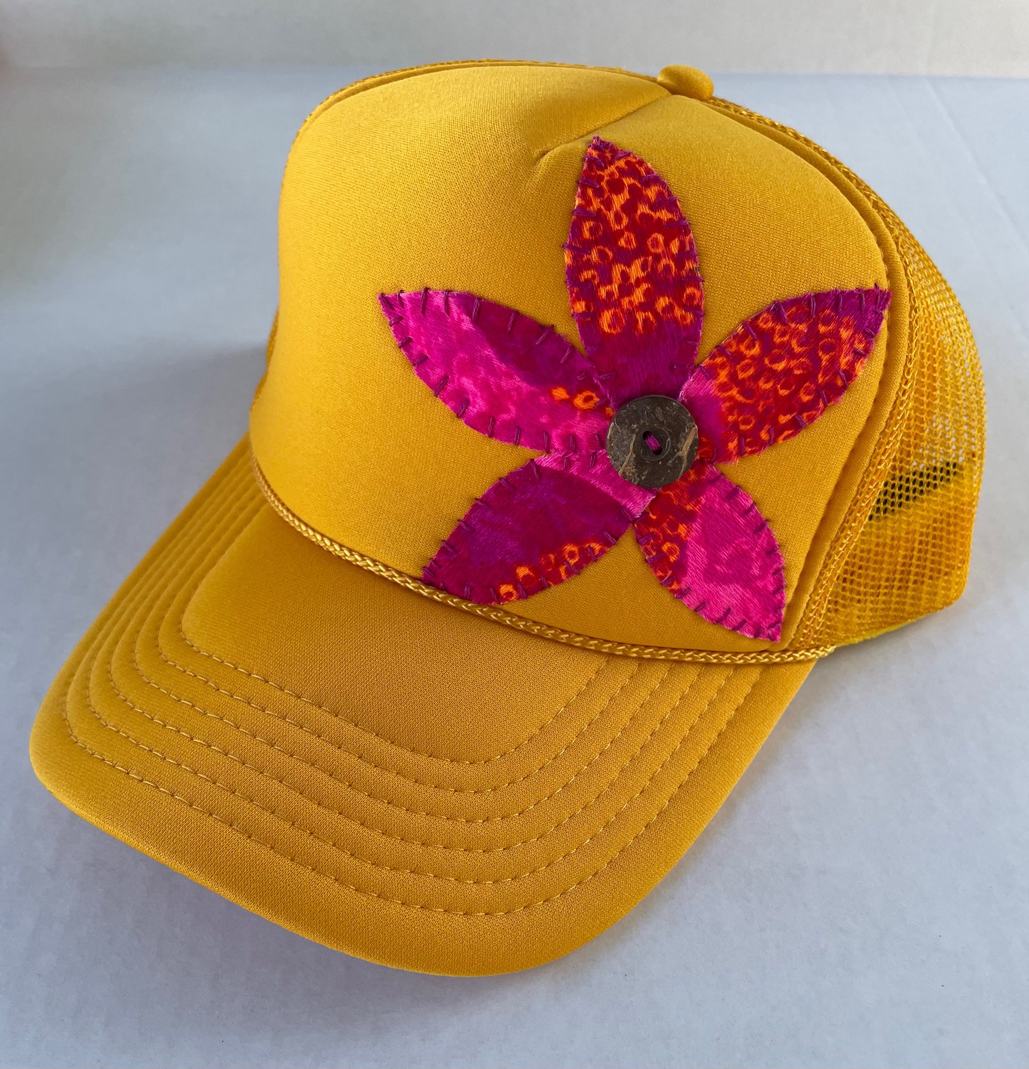 Vintage Hawaiian fabric hand stitched onto a golden yellow trucker.